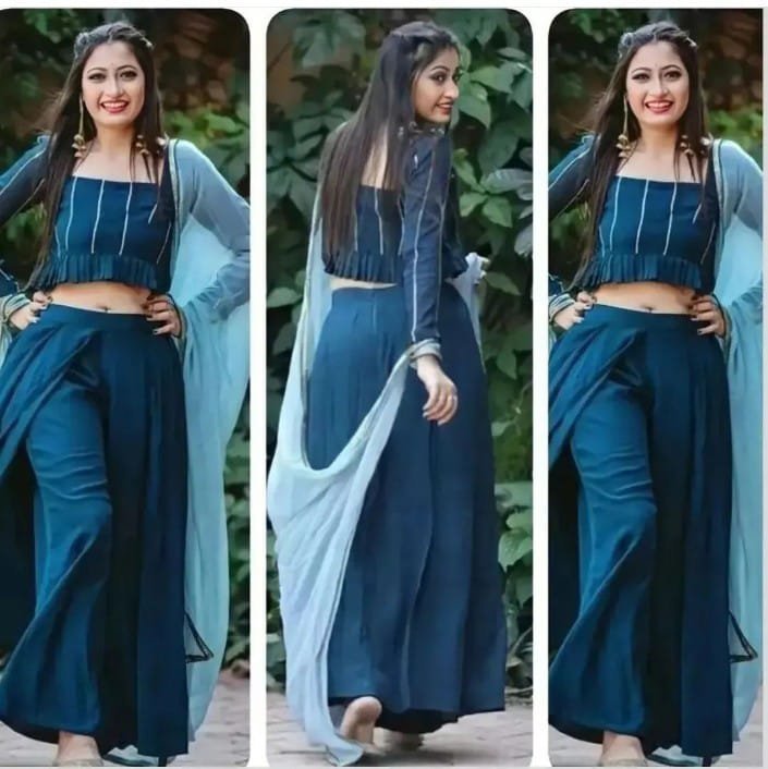 Name: Teal Blue Crop Top With Palazzo and Open Skirt